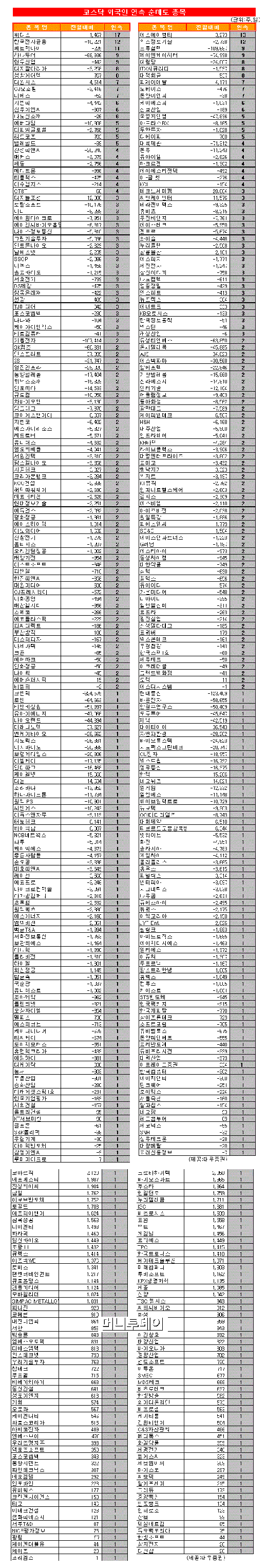 [표]코스닥 외국인 연속 순매도 종목-22일