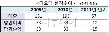 흑자경영을 일궈오던 디오텍은 올 상반기 매출액 57억원, 영업손실 18억원이라는 부진한 성적을 거뒀다. 2분기 삼성전자 등 주요 고객사와의 계약방식이 기존 턴키방식에서 러닝로얄티방식으로 변경됐기 때문. 판매량에 따라 가격을 책정하는 방식으로 향후 매출은 늘어날 전망이지만, 단기적으로는 매출감소를 감수해야했던 것.