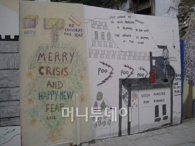 ◇꼬일대로 꼬인 그리스=신다그마 광장 뒷켠엔 총파업 당시 적어 놓은 낙서들이 여전하다. IMF 때문에 그리스 시민들이 모두 감옥살이를 할 것이란 풍자부터 '해피 뉴 이어' 대신 '해피 뉴 피어(Fear, 공포)'라는 씁쓸한 새해 인사도 눈에 띈다. 시내 곳곳엔 폐업한 빈 상가가 즐비하다. 우범지대에 속하는 오모니아 지역엔 대형 호텔이 영업을 중단한 채 을씨년스럽게 서 있다.