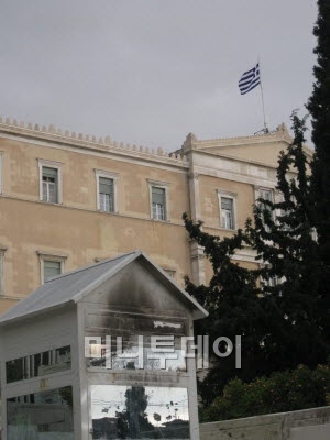 아테네 시내 중심엔 신다그마 광장이 위치해 있다. 한달전 총파업이 벌어졌던 현장이다. 당시 흔적은 여전히 남아있다. 신다그마광장 위편 국회의사당 초소엔 화염병에 그을린 자국이 남아있다. 유리창도 깨져 있어 당시 격렬했던 시위 현장을 말해준다.