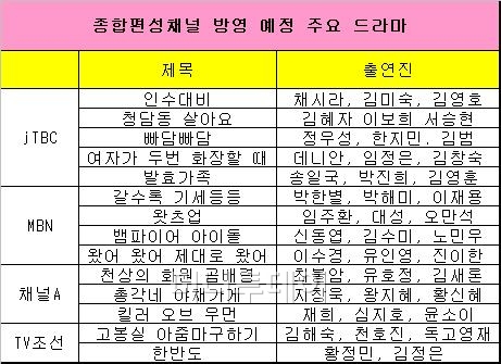 종합편성채널(종편)의 출범은 드라마 제작사들에게 분명 기회다. 종편 4사들이 예능은 주로 직접 제작하는 반면, 주중·주말·일일 드라마 등 대부분을 독립제작사에 맡겼기 때문이다. 특히 일 년에 한두 작품을 만들기도 힘들었던 중소형 제작사들에게는 새로운 출구처럼 여겨졌다.