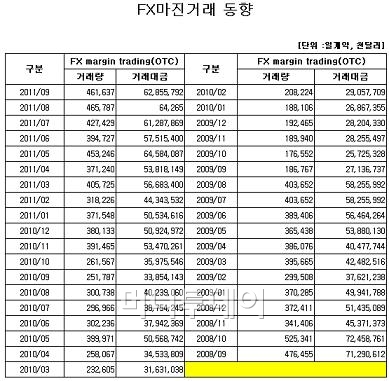 2009년 9월 FX마진 개시증거금이 2%에서 5%로 상향 조정된 후 40만계약에 달했던 거래량이 18만계약대로 절반으로 감소한 바 있다. FX마진거래의 개시증거금과 유지증거금은 1분기중 현행 5%, 3%에서 10%, 5%로 인상될 예정이다.
