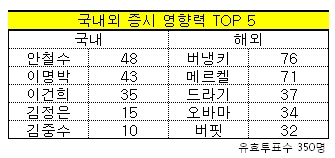 증시 전문가들은 현재 국내 증시에서 가장 영향력이 큰 인물로 안철수 서울대융합과학기술대학원장을 뽑았다. 지난해 1위를 차지했던 이명박 대통령을 2위로 제치고 안 원장이 1위로 올라선 이유는 올해 하반기 정치권과 증시를 강타한 안풍(安風)의 영향력 때문인 것으로 풀이된다.