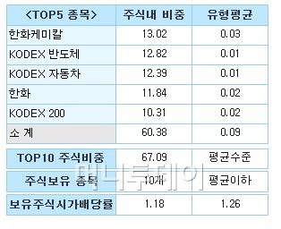 한화그룹주에 집중 투자하는 '한화그룹목표배당형증권투자신탁' 수익률이 주목 대상이다. 펀드평가사 제로인에 따르면 이 펀드는한화케미칼(45,900원 ▼1,650 -3.47%)과한화(117,800원 ▼2,100 -1.75%)의 편입비가 13.02%, 11.84%(2011년 11월 기준)에 달한다. 이 밖에대한생명(4,830원 ▲335 +7.45%),한화손해보험(7,560원 ▲80 +1.07%),한화증권(7,360원 ▲860 +13.23%)등 한화계열 주식, 채권, 기업어음(CP) 등에 50% 이상을 투자하는 것으로 전해졌다.