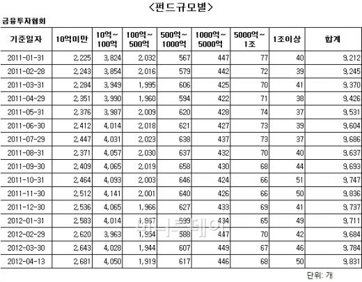 실제 자금 유출세에도 파생상품펀드가 급증하면서 펀드수(13일 기준)가 9831개로 다시 1만개에 육박했다. 이중 10억원 미만 펀드가 무려 2681개로 전체의 27.27%에 달한다. 10억원 이상 100억원 미만 펀드는 4050개다.