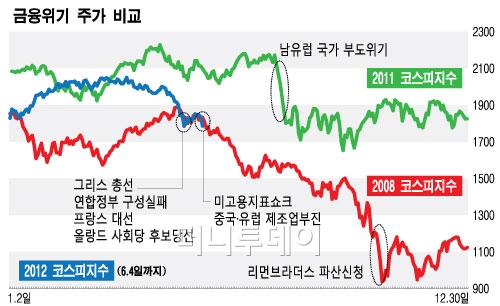 한편 정치적 이슈는 변수로 작용할 전망이다. 이달 그리스와 프랑스의 총선이 열리는 데 이어 하반기에는 미국의 대선과 중국의 정권 이양이 실시될 예정이다. 곽중보 삼성증권 연구원은 "지난 위기와 달리 현재는 정치적 영역이 얽혀 혼란스러운 상황이다"고 말했다. 다만 안전망이 확보돼 있고 정책 공조 여력이 남아있는 만큼 급락세는 빠르게 진정될 것이라는 분석이다.