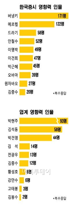 이는 올해초 조사에서 한국 증시에서 가장 영향력이 큰 인물로 안철수 서울대융합과학기술대학원장이 뽑혔던 것과 대조된다. 안 원장은 당시 유력한 대선 후보로 등장하며 정치권과 증시를 강타했지만 올해는 4위(52명,14.1%)에 그쳤다.