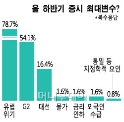 올 하반기 증시 역시 대외이벤트가 최대 변수가 될 전망이다. 응답자 122명 가운데 96명(78.7%·복수응답)이 증시 최대 변수로 '유로존 위기'를 꼽았다. 다음은 '미국과 중국의 경기부양 여부'(66명·54.1%)였다. 반면 △대선(20명·16.4%) △물가·금리인하·외국인 수급(각 2명·1.6%) △통일 등 지정학적 요인(1명·0.8%) 등 국내변수를 언급한 응답자는 제한적이었다.