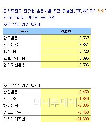 반면 뛰어난 운용성과를 바탕으로 한국운용은 8567억원을 끌어들여 자금 순유입 1위에 이름을 올렸다. 산은운용도 5851억원이 들어왔고, IBK운용과 교보악사운용도 각각 5723억원, 3896억원 순유입을 기록했다.
