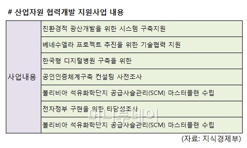 사업 참여대상은 중남미 개발도상국의 각종 경제개발 사업과 업무 방향이 맞는 공공기관이다. 국가 간에 진행하는 협력 채널인 탓에 우선 공공기관으로 한정했다. 구체적인 사업 계획은 △친환경적 광산개발을 위한 시스템 구축 △공공기관 및 민간기관 간 협력사업 중 정부지원 필요성이 있는 사업 △베네수엘라 프로젝트 추진을 위한 기술협력 지원 등이다.