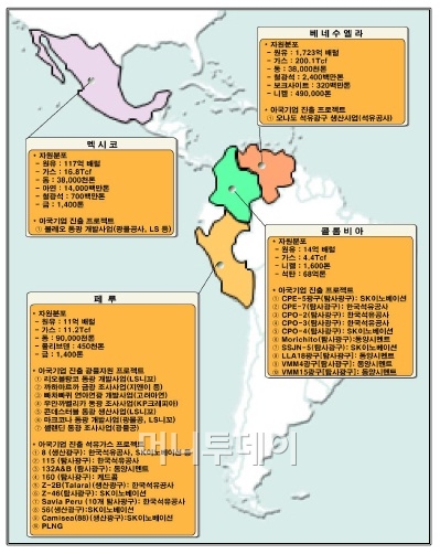 중남미는 각종 자원의 전 세계 매장량 중 △원유 15.9% △천연가스 4.65% △구리 48.3% △리튬 85.8% △은 41.5% △철 28.1% 등이 있는 자원의 보고다. 특히 베네수엘라에만 원유 1723억 배럴이 묻혀있고, 멕시코엔 아연 140억 톤, 페루는 동 9000만 톤을 갖고 있다.