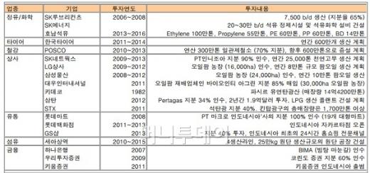 지금까지 유전탐사, 석유정제, 석유화학분야의 투자가 제대로 이뤄지지 않았다는 점은 향후 새로운 성장의 기회로 주목을 받는다. 국내 정유/화학 기업 가운데SK이노베이션(109,800원 ▲500 +0.46%)과호남석유(69,500원 ▲400 +0.58%)가 인도네시아에 설비 투자를 검토하고 있다. 국내에서 생산하는 범용제품의 수출 경쟁력 약화를 현지 투자로 극복하는 기업에 주목할 필요가 있다.