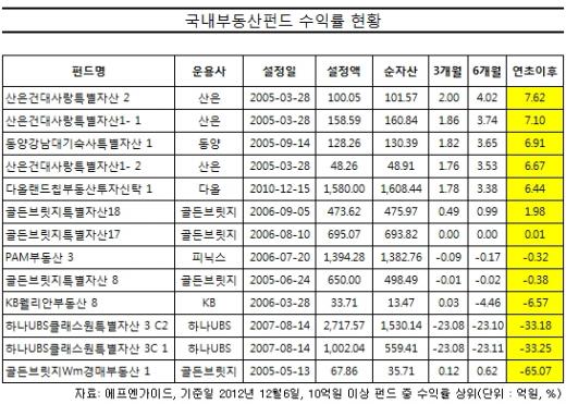 훈풍이 부는 해외부동산펀드와 달리 국내부동산펀드의 수익률은 부진한 상황이다. 에프엔가이드에 따르면 국내 부동산 펀드의 평균수익률은 6일 기준 연초대비 -11.84%를 기록 중이다.