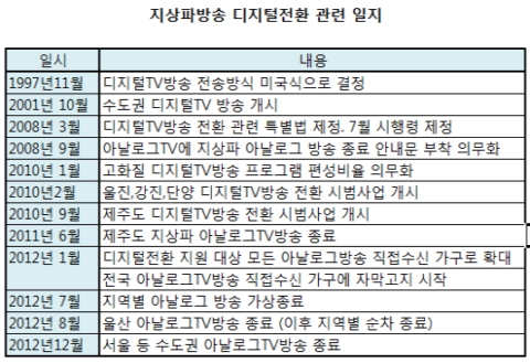 우리나라의 지상파 아날로그 방송 종료는 33개 OECD(경제협력개발기구) 회원국 중 24번째로, 경제규모가 비슷한 다른 나라에 비해 늦은 편이다. 미국식·유럽식 전송방식을 놓고 갈등을 겪다 1997년 결국 미국식 전송방식이 결정됐고, 2001년부터 수도권을 중심으로 디지털TV방송으로 전환이 시작된데 따른 것이다. 2006년부터는 전국에 디지털TV방송 신호가 송출됐고 2008년 관련 특별법이 제정되면서 지상파 아날로그 방송 종료 작업이 시작됐다.