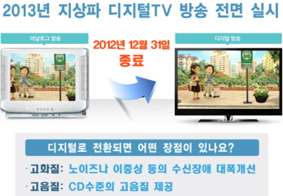 지상파 방송국이 아날로그와 디지털 방송을 모두 송출하다, 디지털로만 내보내기 때문에 이제는 안테나로 지상파를 직접수신하는 가정은 더이상 지상파 방송을 볼 수 없다. 방통위에 따르면 아날로그 방송은 종료됐지만 전국 1734만 방송수신 가구 중 디지털 미전환 지상파 직접수신가구는 5만여 가구에 달하는 것으로 추산된다. 정부는 내년 3월말까지 지역별 지원센터를 계속 운영해 이들 가구에 대한 디지털 지원을 지속할 예정이다.