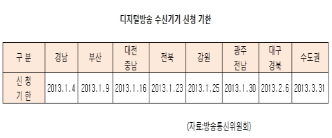 저소득층은 정부 지원을 신청하면 디지털TV 구매 보조금 10만원을 지원받거나 디지털 방송 컨버터나 안테나를 무상 이용할 수 있다. 고령자와 장애인은 디지털 방송 컨버터를 2만원에 구매, 안테나는 무료로 받을 수 있다. 일반가구는 디지털 컨버터를 2만원에 살 수 있으며 안테나 개·보수를 3만원에 할 수 있다. 관할 주민센터, 우체국, 디지털방송 콜센터(124)로 신청하면 된다.