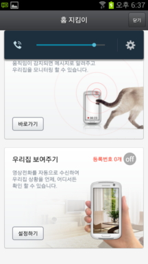 집을 비우고 외출할 경우, 홈 지킴이 기능을 활성화하면 내 폰에서 우리 집을 볼 수 있다. 또 스마트홈 폰의 동작인식 센서가 침입 등 이상 움직임을 감지해 사진을 찍고 집주인한테 보내준다.
