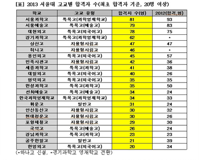 7일 입시업체 이투스청솔에 따르면 2013학년도 서울대 합격자 수(최초 합격자 기준)는 서울과학고가 81명으로 가장 많았다.