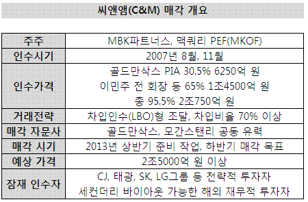 MBK와 맥쿼리는 씨앤앰 매각을 통해 최소 2조5000억원 이상을 회수할 계획을 세운 것으로 알려졌다. 이들은 2007년 당시 씨앤앰의 현금흐름을 바탕으로 인수금의 70% 이상을 차입으로 충당했다. 주권 인수금에 3500억원 남짓 투입됐고 그동안 금융비용이 씨앤앰을 통해 납입된 것을 전제로 하면 6년 만에 원금 대비 약 100%의 차익실현을 목표로 하고 있는 셈이다.