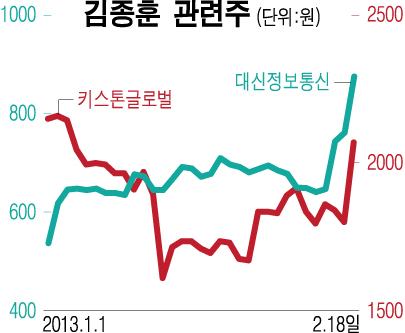 박근혜 대통령 당선인이 새 내각과 청와대 수석 인선을 대부분 마무리하면서 관련주가 들썩인 가운데 이른바 '김종훈테마주'가 단연 눈에 띄었다. 투자자들은 김 후보자의 이력부터 과거 발언까지 뒤적이며 관련주 찾기에 분주했다.