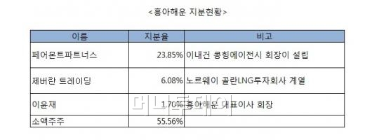 ◇중국국적 최대주주 흥아해운 경영전면에〓콩힝에이전시는 흥아해운 홍콩대리점이자 최대주주로 8년 전 인수합병(M&A) 논란을 불러일으켰던 장본인이다. 지난 2004년 조세피난처인 버진아일랜드에 페이퍼컴퍼니인 페어몬트파트너스를 세우고 흥아해운 지분 13.07%를 사들여 2대주주에 올랐으며 다음해인 2005년에는 지분율을 15.3%로 늘려 최대주주가 됐다. 당시 이윤재 흥아해운 회장의 지분이 1.9%에 불과하고 창업주 일가가 지분을 대량으로 처분해 지분율이 6.5%로 줄어든 상태여서 페어몬트파트너스의 지분 취득은 역외자본의 M&A 시도로 관측되기도 했다.