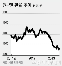 반면 한국의 주름살만 깊어진다. 수출은 직격탄을 맞았다. 수출 둔화, 무역수지 흑자폭 둔화가 가시화됐다. 수출 주력 품목인 자동차산업에도 먹구름이 끼고 있다. 한국자동차산업연구소가 발간한 '최근 엔화 약세와 자동차산업 영향' 보고서에 따르면 원/엔 환율이 10% 하락하면 한국 자동차 수출액이 12% 가량 감소한다. 2011년 자동차 품목의 수출액 기준으로 추정하면 453억1200만불의 12%인 54억3700만 달러가 줄어드는 셈이다. 최소한의 가격 경쟁력을 유지한다 하더라도 버티기 쉽지 않다.