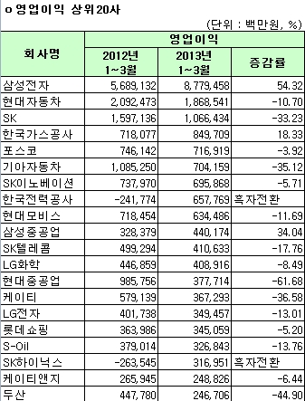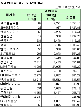 [표]코스피 1Q 연결 영업익-증가율 상위 20개사