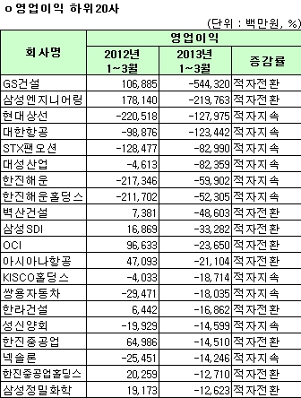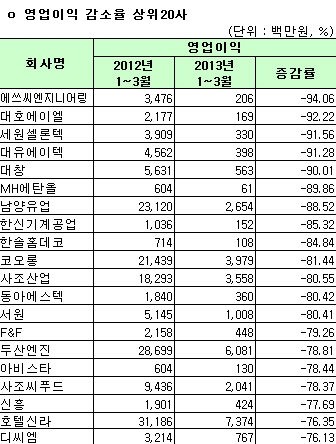 [표]코스피 1Q 연결 영업익-증가율 하위 20개사