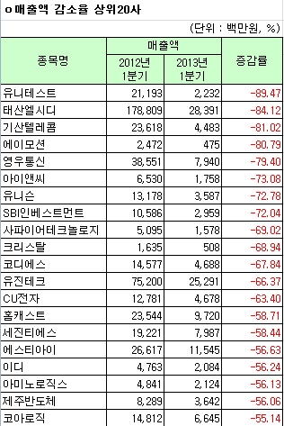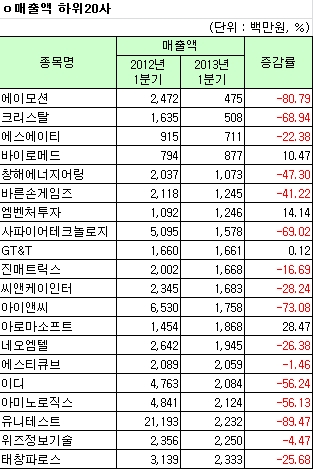 [표]코스닥 1Q 연결 매출액-증가율 하위 20개사