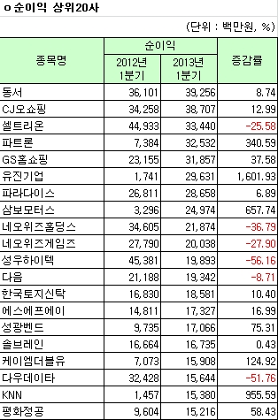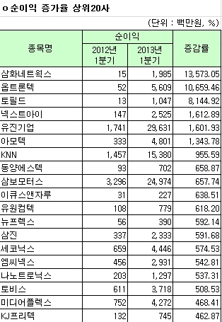 [표]코스닥 1Q 연결 순익-증가율 상위 20개사