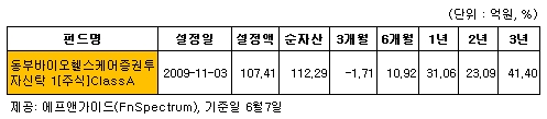 2009년 11월 출시된 '동부바이오헬스케어 증권투자신탁1[주식]ClassA' 펀드는 지난 7일 기준 1년 수익률이 31.06%를 기록했다. 3년 누적수익률은 41.40%다.