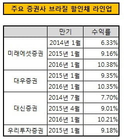13일 금융투자업계에 따르면 미래에셋증권은 최근 2014년 1월과 7월, 2015년 7월 만기의 브라질 할인채를 상품 라인업에 추가했다. 모두 잔존만기가 2년 이내인 상품들로 가장 짧은 상품은 6개월이다. 우리투자증권도 2015년 1월 만기의 할인채를 추가했고 대신증권과 대우증권은 이번 주 각각 3개, 2개의 할인채를 선보였다.