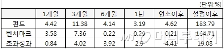 이 펀드는 10번째 생일을 맞은 지난 3분기에 11.38%의 수익률로 벤치마크(코스피의 95%)를 4.02%포인트 상회하면서 국내 주식형 펀드 중 최상위 성적으로 올라섰다. 설정 이후 수익률은 벤치마크 대비 19.08%포인트 높은 183.79%에 달한다.