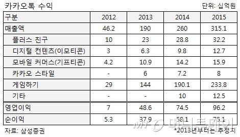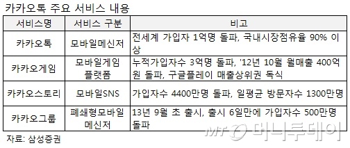 이런 성장세로 카카오의 기업가치는 지난해보다 4배가량 높아진 것으로 추정된다. 카카오는 지난해 중국 텐센트와 국내 위메이드에서 920억원을 투자받았는데 이들이 취득한 지분 19.3%는 주당 2만원가량에 거래됐다.