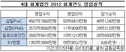 특히 EY한영은 타 법인보다 수익 감소세가 크다. 지난해 총 영업수익(매출액)은 1353억원으로 전년비 3.3% 늘었지만 영업이익은 89억9900만원으로 전년비 20.3% 감소했다. 특히 당기순익은 전년비 83.8% 줄어든 4066만원에 불과했다. 같은 기간 삼일과 삼정의 당기순익이 각각 35.2%, 25% 줄어든 것과 비교된다.