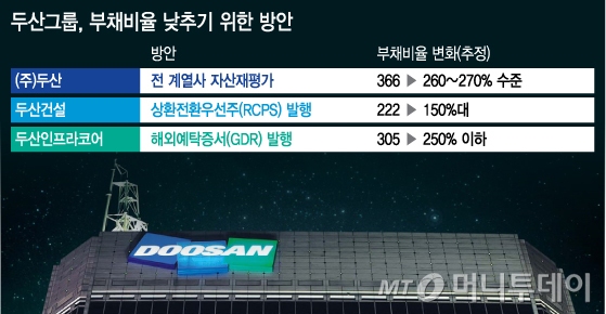 정지택두산중공업(127,100원 ▲4,500 +3.67%)부회장은 지난달 13일 기자와 만나 "두산이 밥캣 등을 인수·합병(M&A)하면서 부채비율이 높아진 것은 사실이지만 이 비율을 낮추기 위해 해외예탁증서(GDR)를 발행하는 등 모든 방법을 동원할 것"이라고 언급했었다.