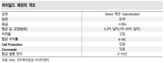 하이일드 본드는 S&P의 신용등급 BBB 이하, 무디스의 신용등급 Baa 이하에 해당하는 채권으로 두산건설이 이번에 국제 신용평가사에서 신용등급을 받으면 하이일드 본드 수준일 것으로 예상된다.