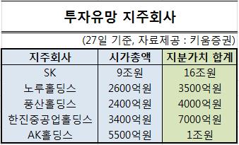◇유망 지주회사 어디?=박중선 키움증권 연구원은 "현재 시장에 영업가치가 충분하고 성장 가능성을 확신할 수 있는 기업이 많지 않다"며 "이에 따라 알짜 비상장 자회사들을 거느리고 있는 등 자산가치가 유망한 지주회사들에 대한 관심이 당분간 이어질 것"이라고 내다봤다.