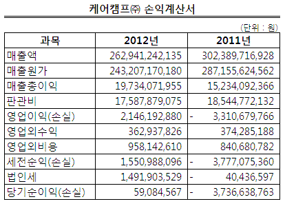 케어캠프의 매출액은 2011년 3024억원까지 올랐다가 2012년 2629억원으로 다소 낮아졌다. 지난해 매출액은 3000억원 안팎으로 추정되는데 삼성의료원이 이른바 '일감 몰아주기' 문제를 의식해 공급처를 다변화하면서 최근 정체되는 모습이다.