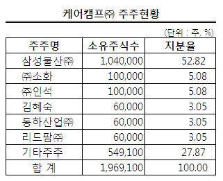케어캠프는 2000년 4월에 설립된 의료용품 판매사로 진료재료를 비롯한 의약품, 의료장비 및 진단시약 등을 중개하고 있다. 납입자본금은 100억원 안팎이지만 삼성 자회사인 삼성의료원에 사실상 독점적으로 물품을 대면서 매출은 15년 만에 3000억원을 넘어선 대형사로 성장했다.