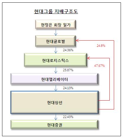 현대그룹은 현대상선이 국내 2대 컨테이너선사로 수출 국가인 우리나라의 기간 수송망을 책임지고 있어 자금난의 막다른 골목에서도 갱생의 여지가 있을 것으로 기대한다. 최대 채권자인 한국산업은행이나 정부의 지원책을 기대하는 것이다. 그러나 다른 주축인현대엘리베이(99,400원 ▲800 +0.81%)터에 대해서는 우려가 깊다. 수천억대 파생상품 손실과 자회사 현대상선의 부실전이로 누적적자가 개선되지 않을 경우 유동성 문제에 직면할 수도 있다는 위기감을 갖고 있다.