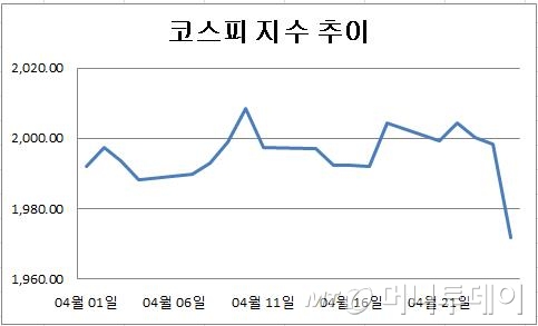 ◇20일 이동평균선 깨진 코스피…현·선물 매도 '악순환'=이날 코스피 지수는 전일 대비 26.68포인트(1.34%) 내린 1971.66에 거래를 마쳤다. 최근 3일 연속 약세를 거듭하며 2000선을 반납한 것은 물론 20일 이동평균선(1995p)마저 무너뜨렸다.