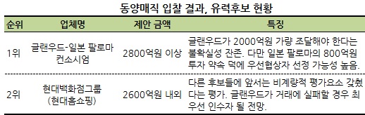동양매직 매각을 위한 입찰 결과 계량 및 비계량 측면에서 글랜우드 컨소시엄과 현대백화점그룹(현대홈쇼핑)이 1, 2위를 차지한 것으로 나타났다.