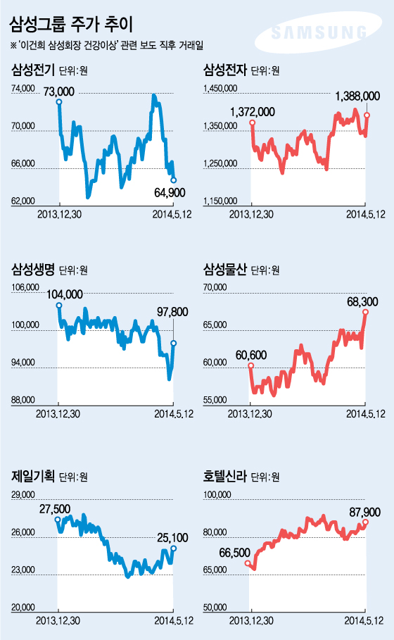 이날 삼성 계열사 주가의 향방이 갈린 것은 이 회장 체제 이후의 지배구조 개편과 관련이 있다는 분석이다. 향후 지배구조 개편 과정에서 핵심 역할을 할 것으로 전망되는 삼성전자, 삼성생명, 삼성물산 등을 비롯해 이 회장의 장녀 이부진 사장이 이끄는 호텔신라와 차녀 이서현 에버랜드 사장의 몫으로 여겨지는 제일기획 주가가 크게 뛰었다.