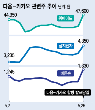 26일 코스닥 시장의 화두는 '다음카카오'였다. 국내 2위 포털업체 다음과 국내 1위 모바일 메신저 업체 카카오의 합병 소식에 관련주들이 들썩였다. 카카오의 지분을 보유하고 있는 코스닥 업체들의 주가가 일제히 급등했다. 이웃(코스피 시장)에 상장된 포털 대장주NAVER(202,000원 ▲500 +0.25%)도 덩달아 움찔했다.