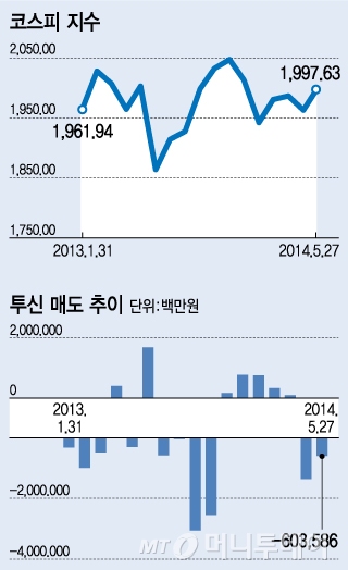 ◇투신, 9거래일 동안 1조원 이상 순매도=27일 코스피 지수는 전거래일 보다 12.72포인트(0.63%) 내린 1997.63에 거래를 마쳤다. 지수가 2000 아래로 떨어진 것은 지난 13일 이후 10거래일만이다. 이날 지수를 끌어내린 것은 기관이었다. 기관이 순매도 한 1129억원 중 투신의 펀드환매 규모가 1051억원. 기관이 파는 물량 대부분이 투신이었던 셈이다.