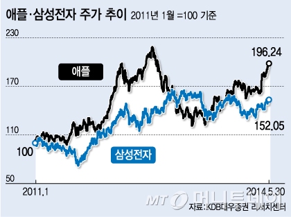 애플의 주가가 삼성전자 주가와 유사한 움직임을 보이고 있기 때문이다. 즉 애플 주가가 오르면 삼성주가도 함께 오르고, 주가가 약세일 때는 함께 내리는 '커플링'이 나타나고 있다.