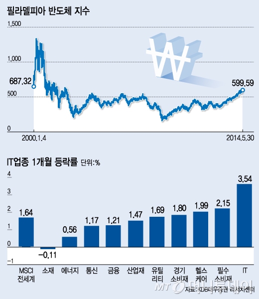 KDB대우증권 리서치센터에 따르면 지난 1개월 동안 전 세계 시장에서 IT업종은 3.5% 상승하며 MSCI 전세계 시장 상승률 1.6%를 크게 웃돌았다. IT업종의 수익률은 △필수소비재(2.2%) △헬스케어(2.0%) △경기소비재(1.8%) △유틸리티(1.7%) △산업재(1.5%) 등을 모두 앞질렀다.