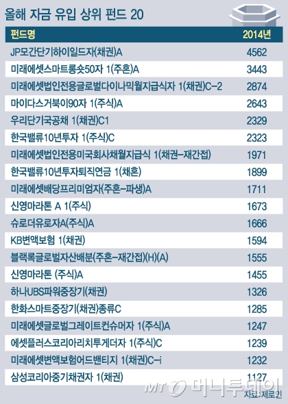 그렇다면 자금 유출분까지 포함해 올 들어 설정액이 가장 많이 증가한 펀드는 무엇일까. 펀드평가사인 제로인은 올해 4562억원을 모은 JP모간단기하이일드자(채권)A을 꼽았다. 설정액 증가 펀드 상위 20위를 살펴보면 중위험·중수익을 추구하는 롱숏펀드, 채권펀드, 가치주펀드, 배당주펀드가 줄을 잇는다. 증시 상승기에 힘을 얻는 인덱스펀드나 모멘텀 투자를 지향하는 공격적인 성향의 펀드들은 아직도 시장의 관심을 받지 못하고 있다.