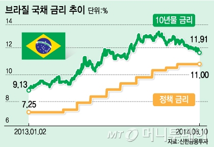 하지만 최근 기준금리와 환율은 안정세로 돌아섰다. 지난달 28일(현지시간) 브라질 중앙은행은 1년2개월만에 금리를 11%로 동결했다. 10년물 국채금리도 최근 11%대로 진입하며 하향추세다. 원/헤알 환율도 450원을 전후로 박스권에서 등락하고 있다.